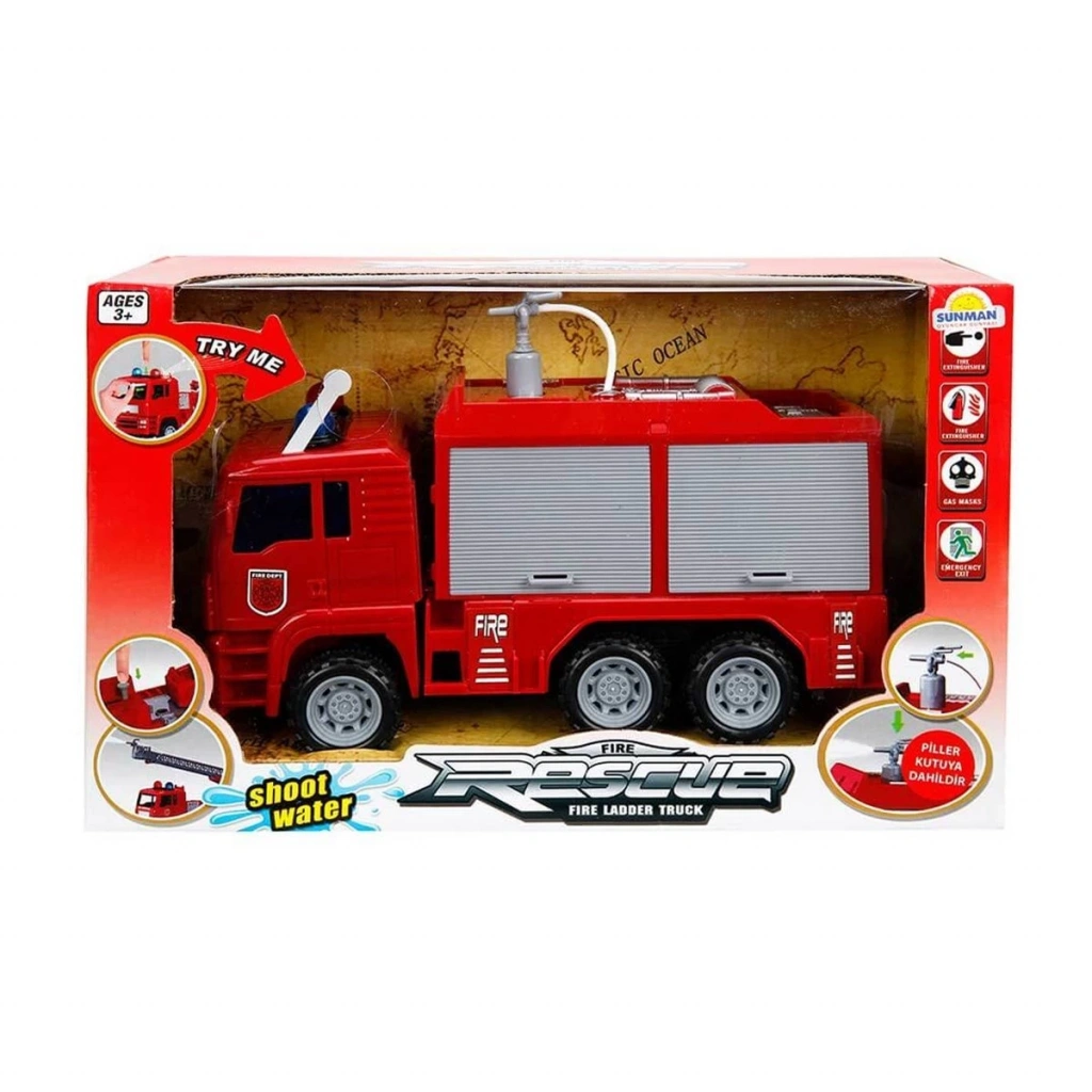 İtfaiye Aracının; su püskürtme, ses ve ışık fonksiyonu, uzatılabilen merdiven özelliği bulunmaktadır.
